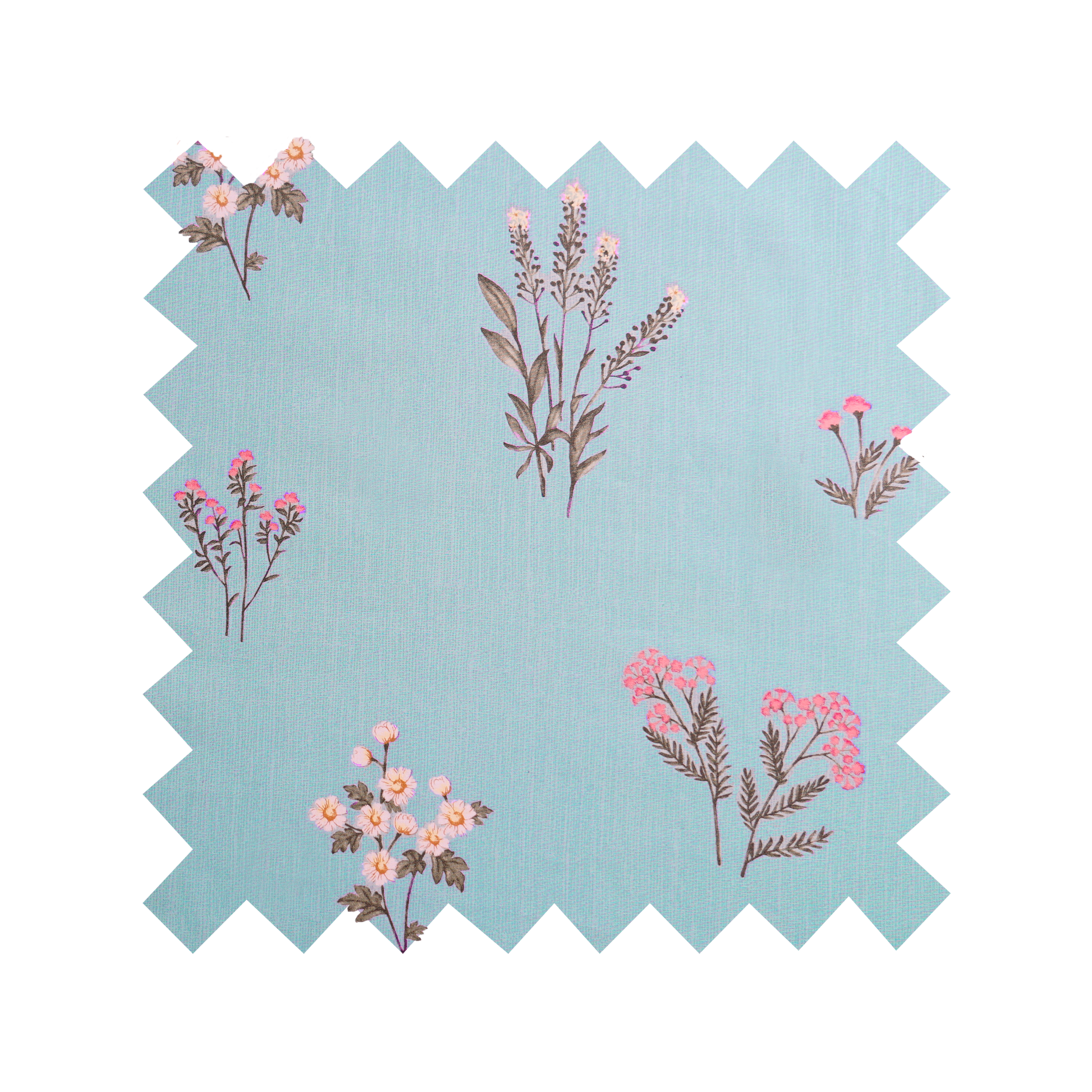 - Wild flowers scattered on light blue background, reminiscent of a countryside meadow