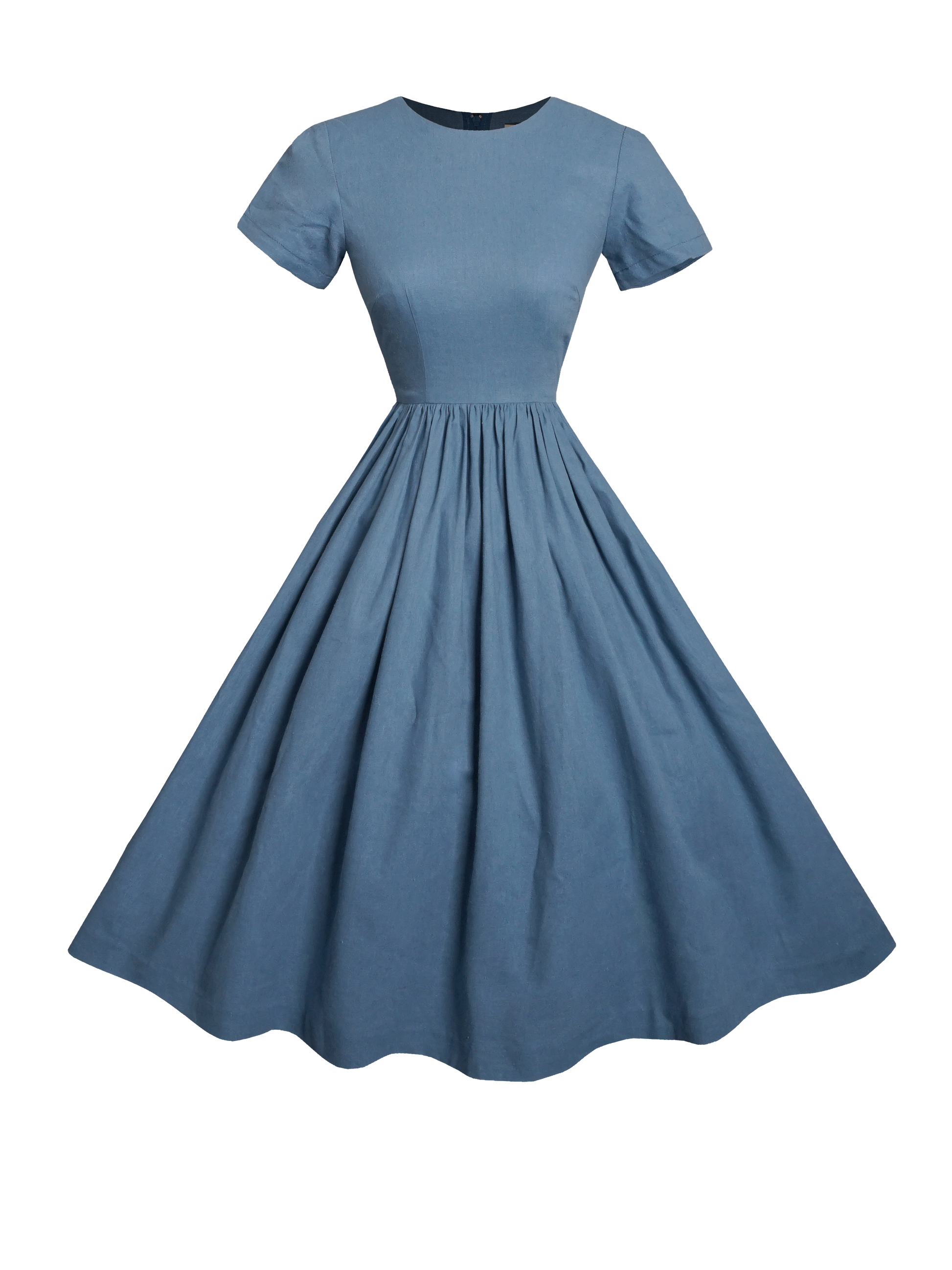 A classic 1950s Silhouette, this beauty is expertly tailored at the bodice and flared out to a full gathered skirt. It features a simple rounded neckline with short sleeves, designed for everyday comfort and is suitable for any occasion.
