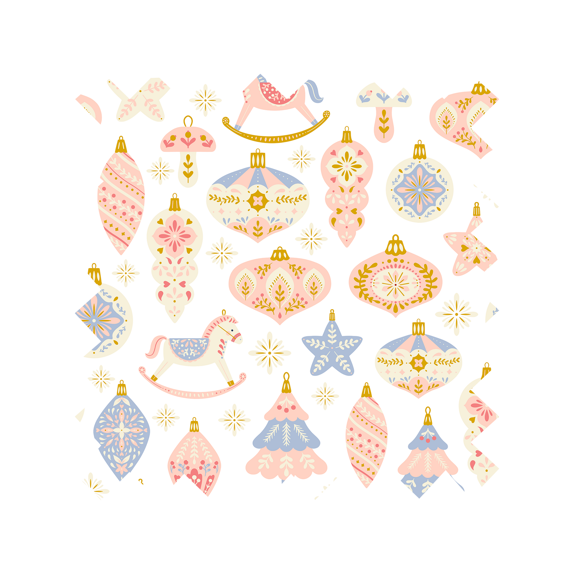 - Christmas fabric featuring cute pastel pink and blue ornaments in various shapes and sizes.