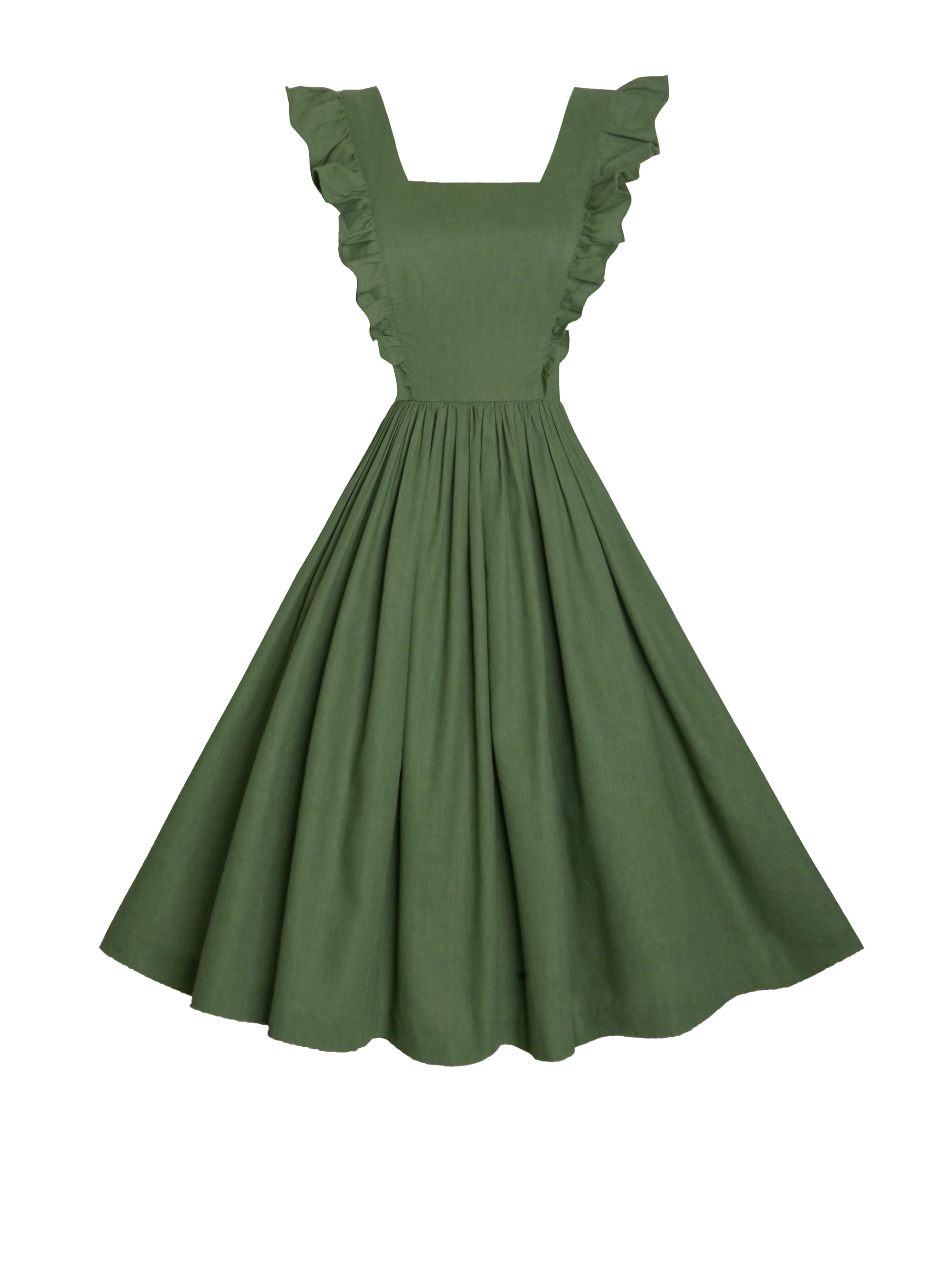 This retro classic ruffled pinafore dress features a flattering square neckline in front and dips to a low "V" in back while hidden pockets keep your essentials close at hand (phone, lipstick, maybe a secret admirer's note?)