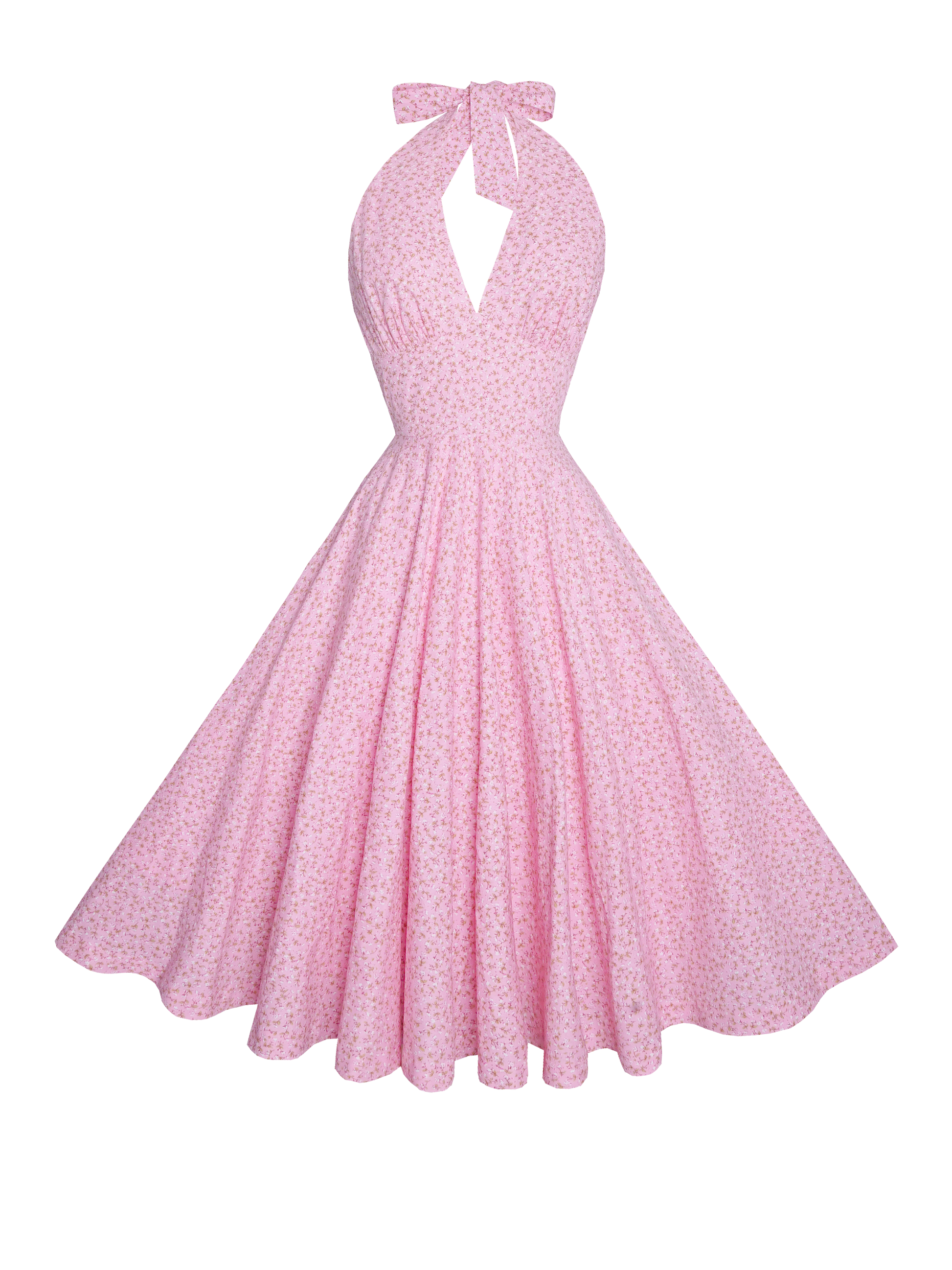 This stunning beauty of a dress is a wonderful reproduction of a 1950s dress. It features a flattering halter neckline and is designed to hug your natural curves.