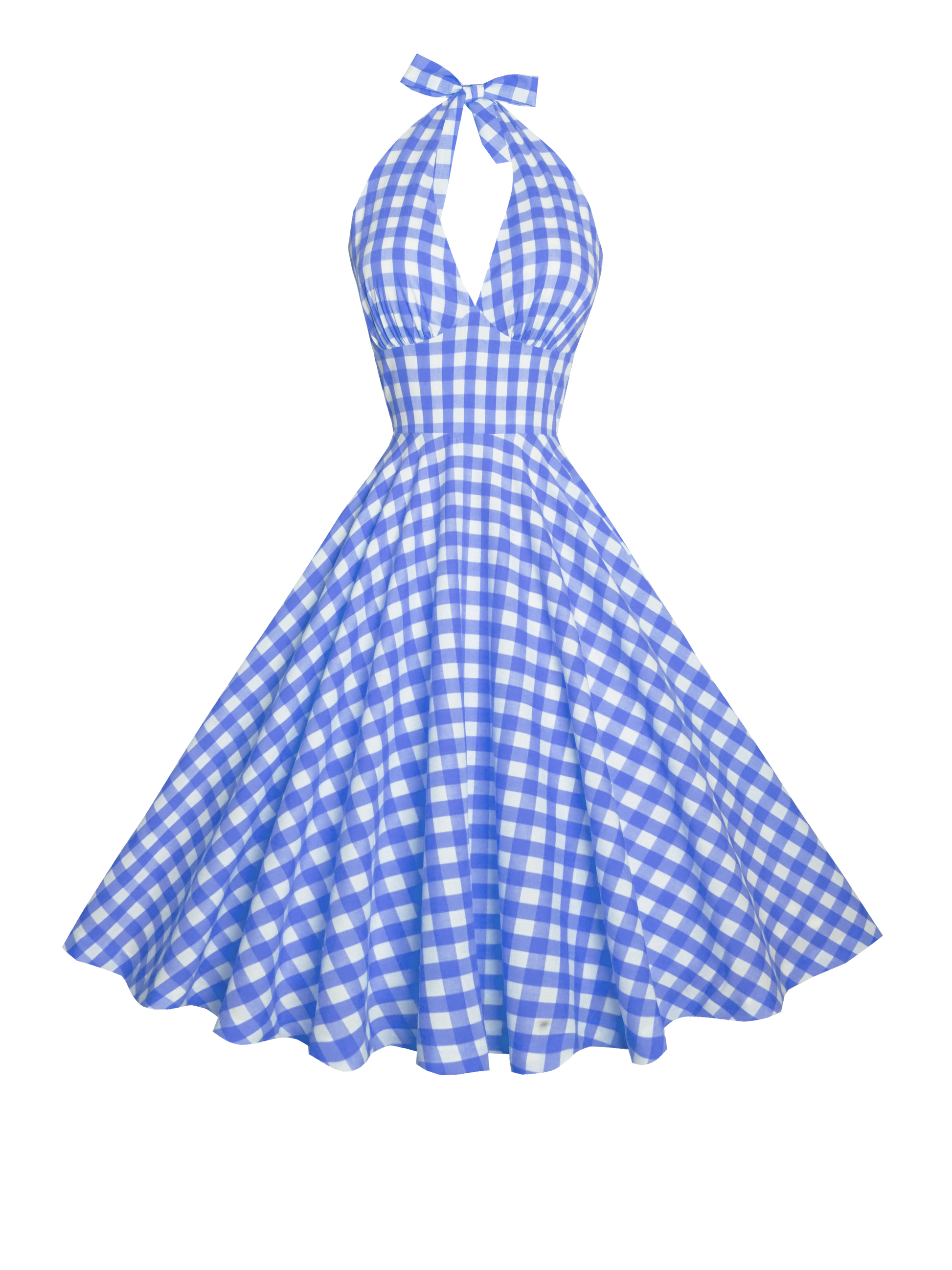 This stunning beauty of a dress is a wonderful reproduction of a 1950s dress. It features a flattering halter neckline and is designed to hug your natural curves.