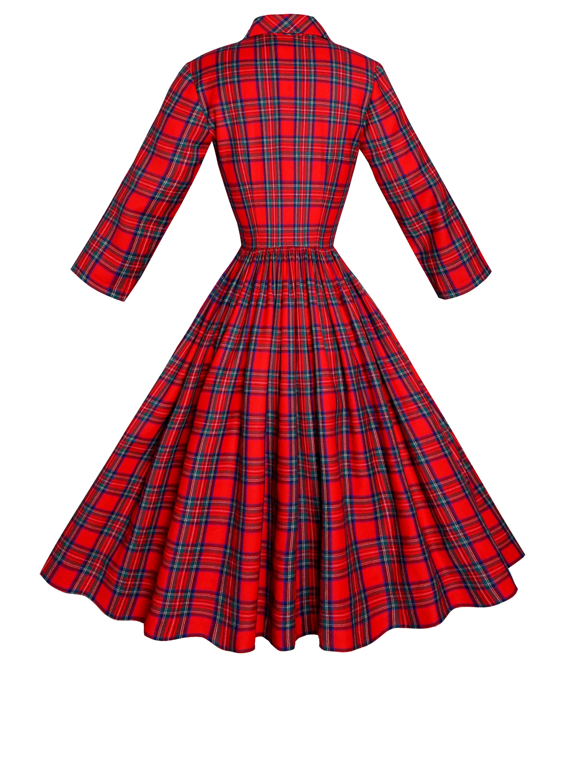 The Natalie Dress is a 1940s style shirtdress that could be worn during all seasons. She is forever feminine and flattering in this classic wide lapel collar and 3/4 sleeves. Perfect for the office, you'll feel stylish all day. Fitted bodice with a nipped in waist and a full gathered skirt.