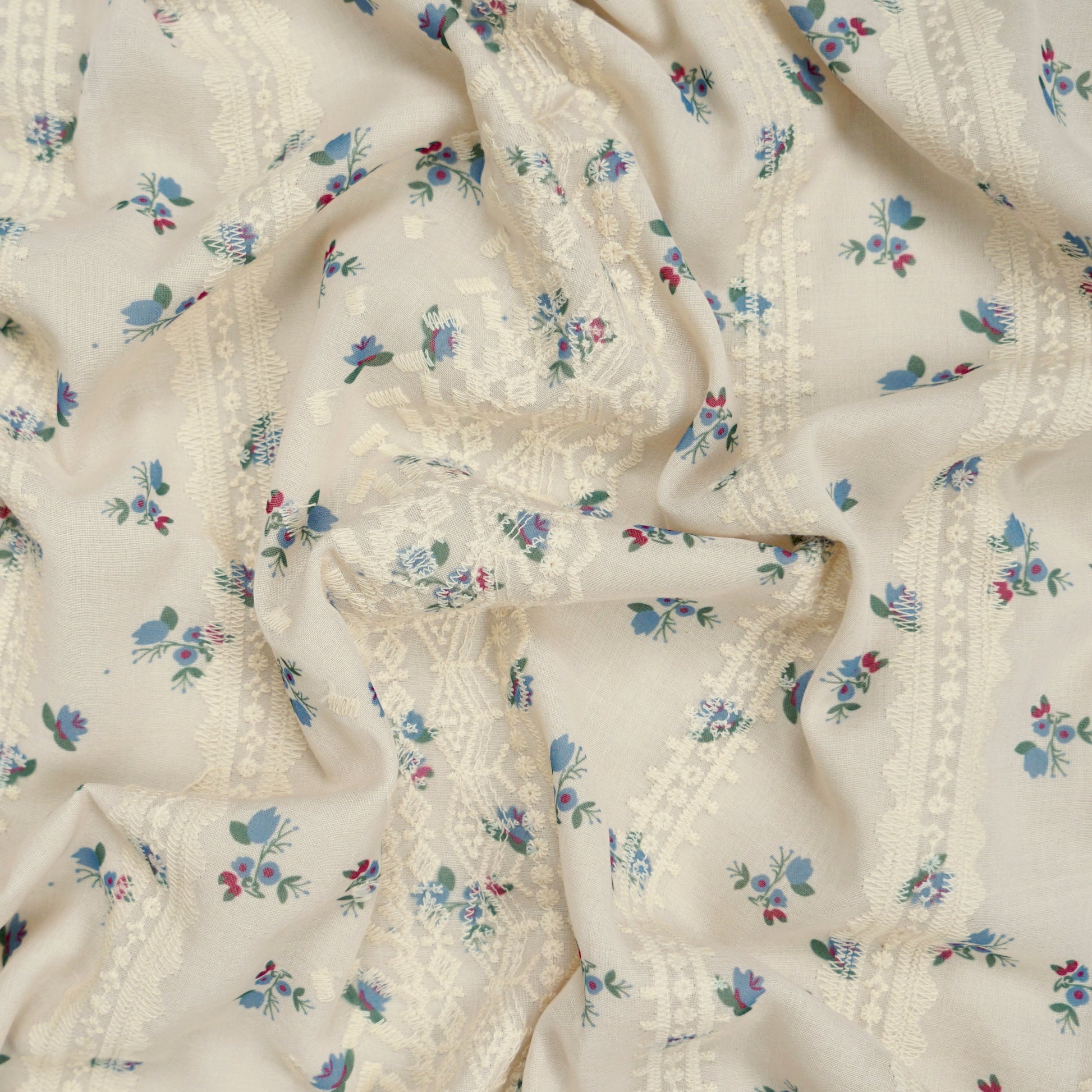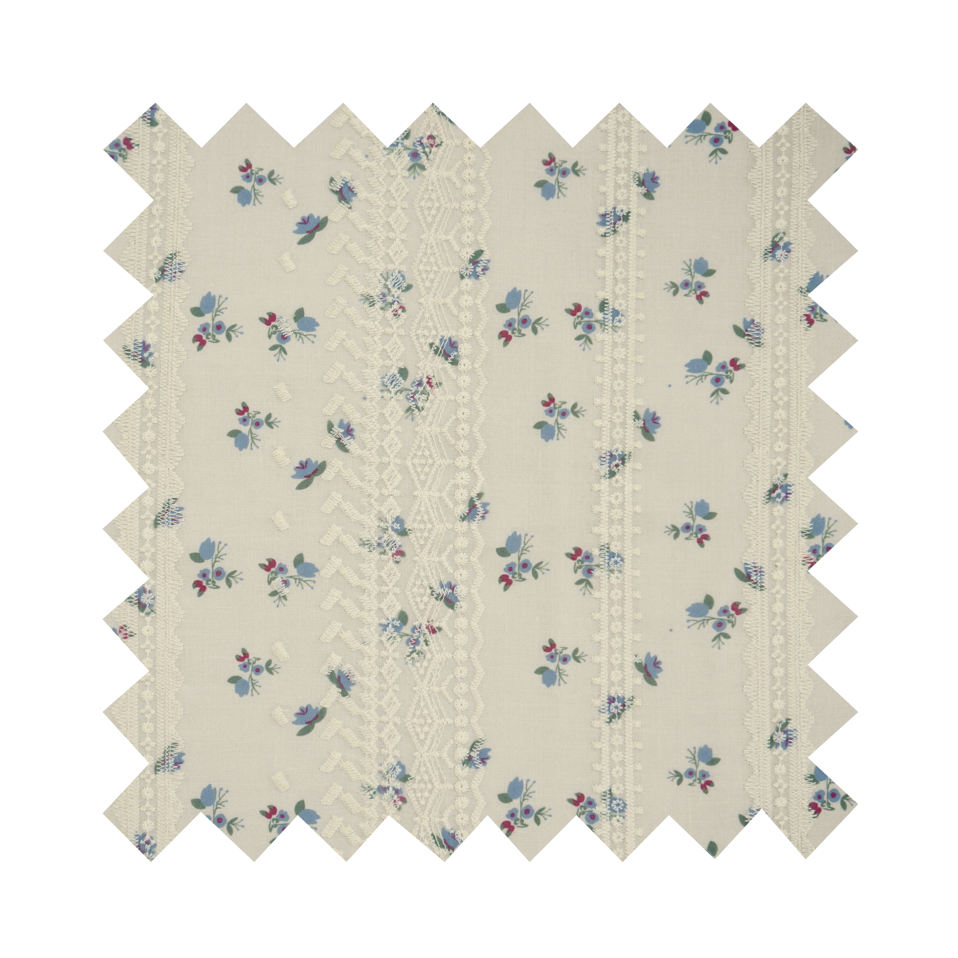 - A vibrant blue floral print adorned with delicate ivory lace ribbons and meticulously applied in horizontal stripes.