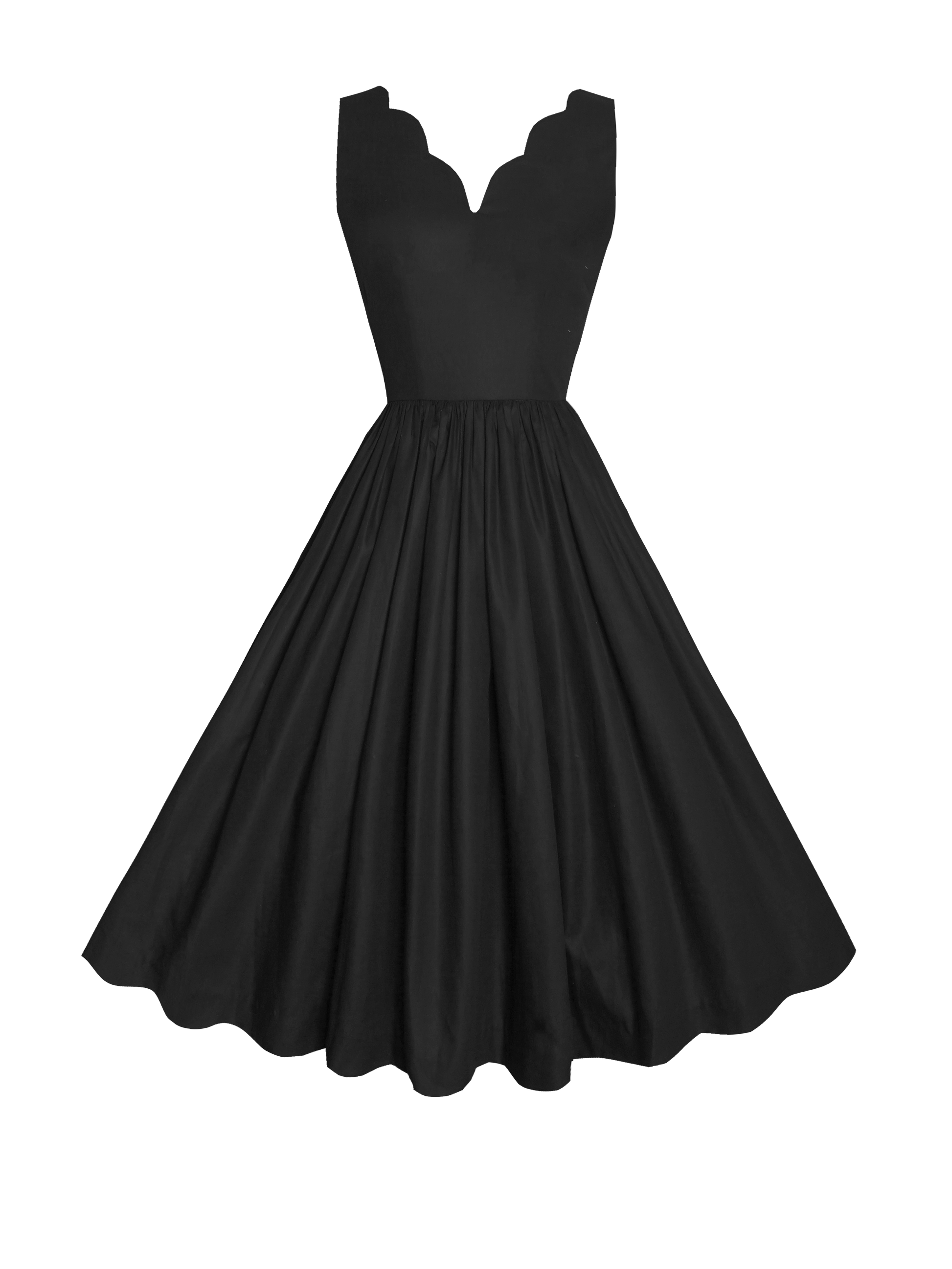 This 40's inspired dress has everything your vintage heart desires. Our Victoria dress features a plunging scalloped v-neck that leads to a nipped in waist.